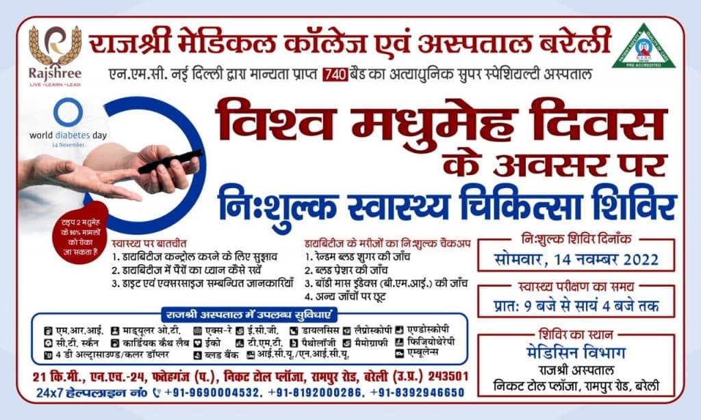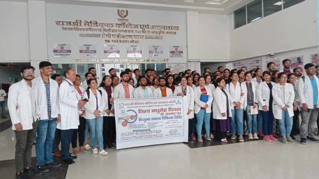 राजश्री मेडिकल काॅलेज एवं अस्पताल के द्वारा विश्व मधुमेह दिवस के अवसर अनेक स्थानों पर निःशुल्क चिकित्सा एवं जाँच शिविर का आयोेजन।
