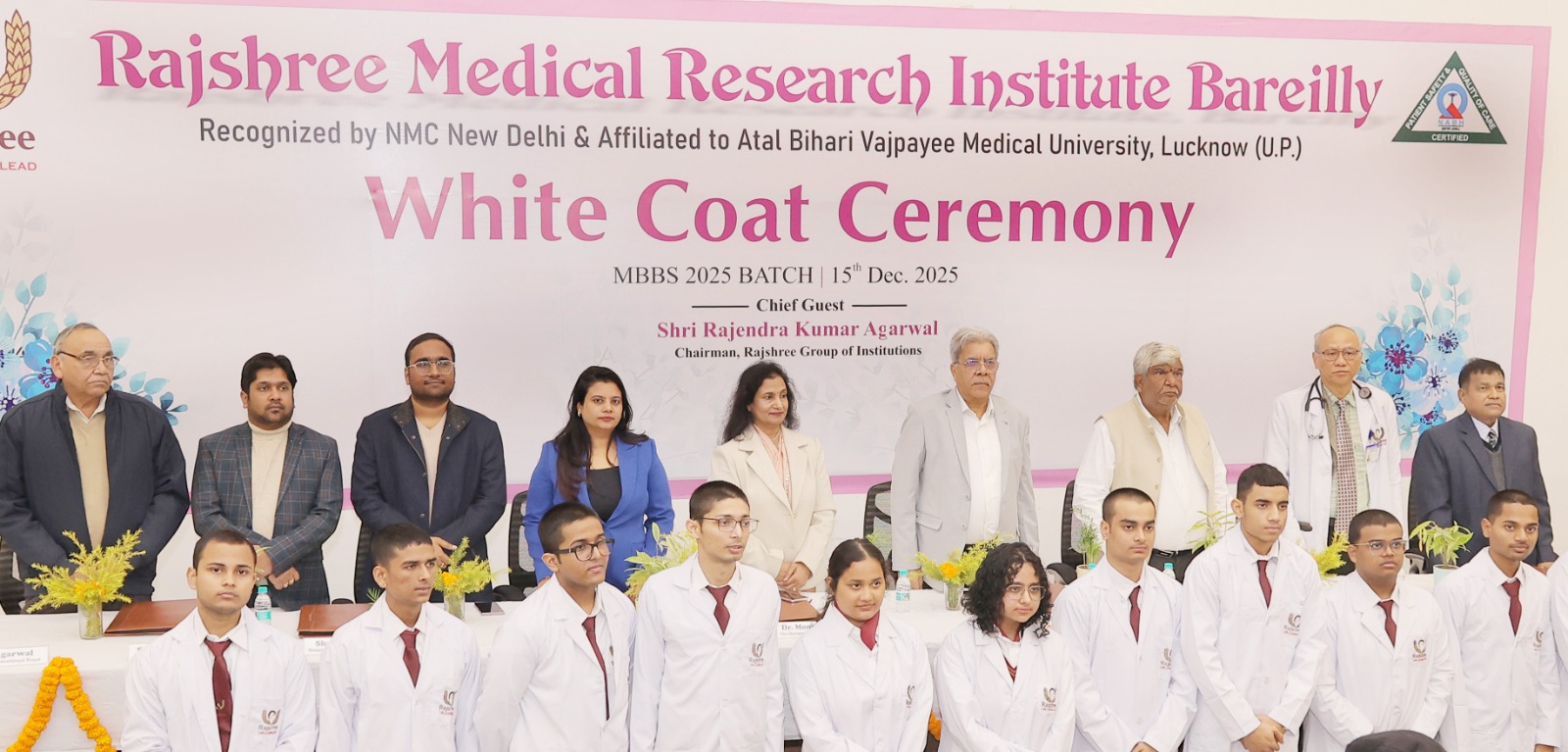 राजश्री मेडिकल रिसर्च इंस्ट्टीयूट में एम.बी.बी.एस. 2025 बैच के नव प्रवेशी छात्र/छात्राओं के प्रथम वर्ष में प्रवेश के अवसर पर व्हाइट कोट समारोह का आयोजन माँ सरस्वती जी के समक्ष संस्थान के चेयरमैन श्री राजेन्द्र अग्रवाल जी ने दीप प्रज्वलित करके किया।
